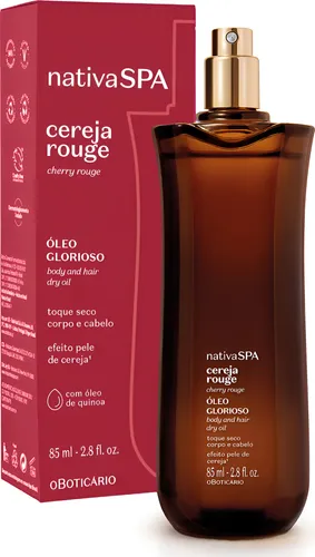 Óleo multifuncional para corpo e cabelo — Nativa SPA Cereja Rouge 85 ml. Textura leve e de toque seco, ideal para quem busca hidratação profunda sem oleosidade. Enriquecido com óleo 100% puro de quinoa e extrato de cereja, promove pele macia, nutrida e com sensação acetinada e cabelos sedosos com brilho intenso. Com a fragrância exclusiva “Sexy Cherry” — um aroma oriental-frutal ambarado, sensual e duradouro — transforma o cuidado diário em um ritual de charme e sofisticação. Perfeito para uso pós-banho ou ao longo do dia, no corpo e nas pontas dos cabelos.